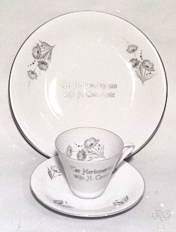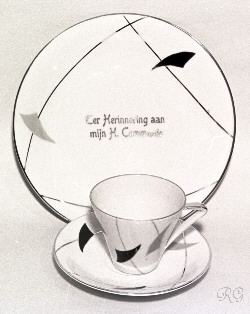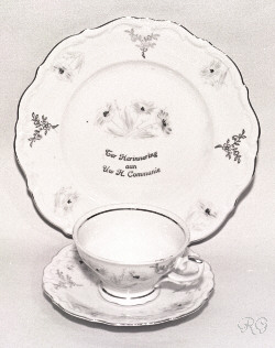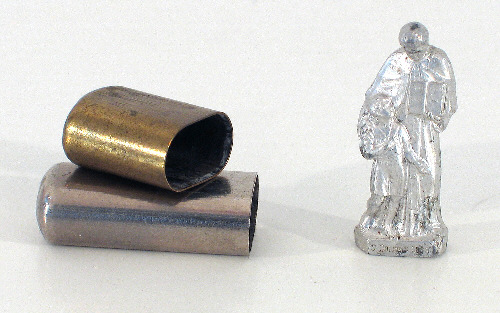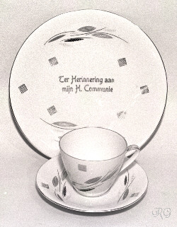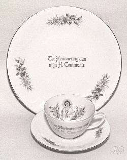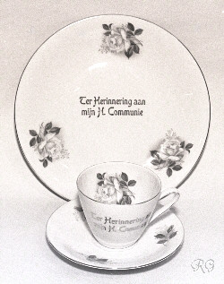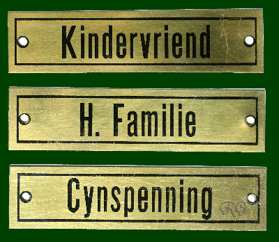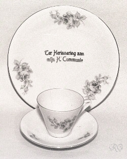 0. Beelden ogen Glazen ogen voor beelden in diverse maten ca. 19?? RG ** 1. Opschriften koperen tekstplaten voor offerblokken en beelden ge-etst in koperplaat 20 x 80 mm ca. 1935 ? RG ** 2. Opschriften tekstsplaten voor offerblokken en beelden Gedrukt op verkoperde staalplaat ca. 25 x 115 mm ca. 1950 ? RG ** 3. Reiskokertje met beeldje metalen reis-etuitje voor beeldje ca. 30 mm hoog ca. 19?? RG 4. Armbandje Armbandje met medailles en bedeltjes vaak geschonken aan meisjes bij de eerste communie ca. 1960 ? RG 5. Boekenlegger engeltje papieren engeltje uitgevoerd als boekenlegger 100 mm hoog - ca. 1965 RG 10 - 11. Ornamenten Metalen versierselen in relief, soms verguld. Gebruikt op bijbels, misboeken, kasuifels, e.d. Kaarten (16x27cm) t.b.v. verkoop. ca. 1930 ? Meer details bij: Ornamenten RG 12 - 19. Communie bordjes Diameter ca. 20 cm Jaren '60 zie ook: Communie
